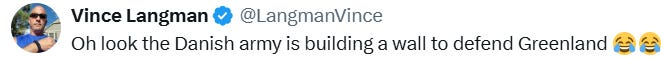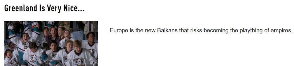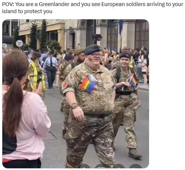 They conclude that with the failure in Iran, Greenland (run by feckless Europeans…) is a much easier target for a quick victory plus the interviewer also mentioned this piece: