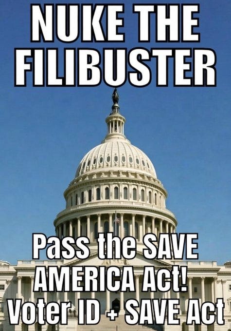 There is finally some limited movement on the effort to stop or at least do something about voter fraud as the GOP controlled Senate and Senator Thune continue their efforts to kill the Save America Act (Voter ID and Citizenship Proof):