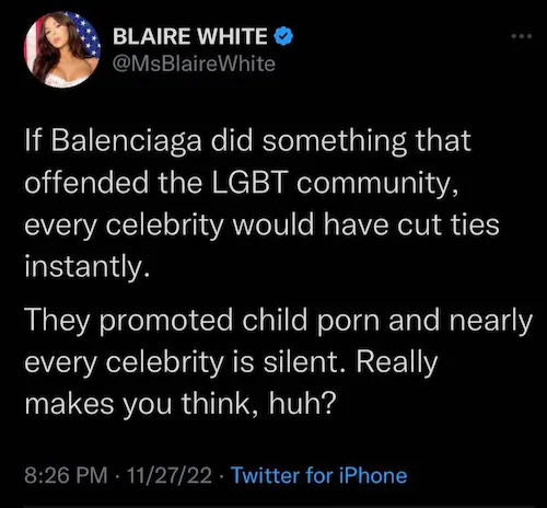 Frankly, the Balenciaga is absolutely bizarre and disturbing. There is a lengthy Twitter thread posted by @curioslight who’s account seemed to be offline or banned the last time I checked it, but is now back up (NOTE: The thread was reposted elsewhere and you can read it on one page here thanks to the Thread Reader). One of the first tweets noted: