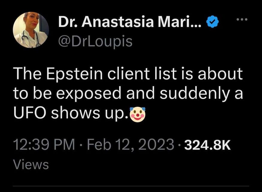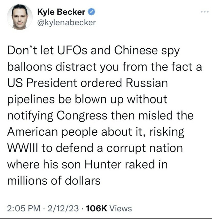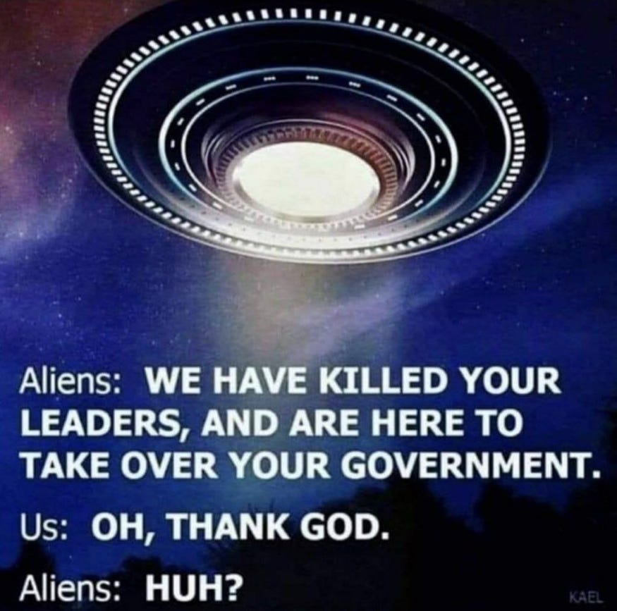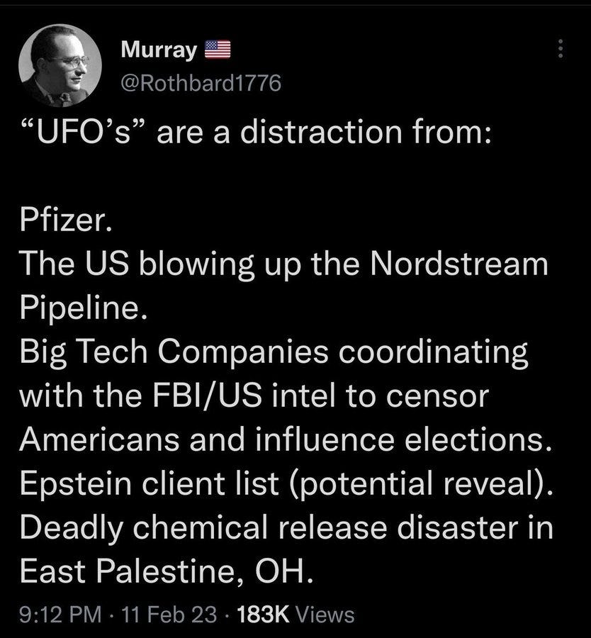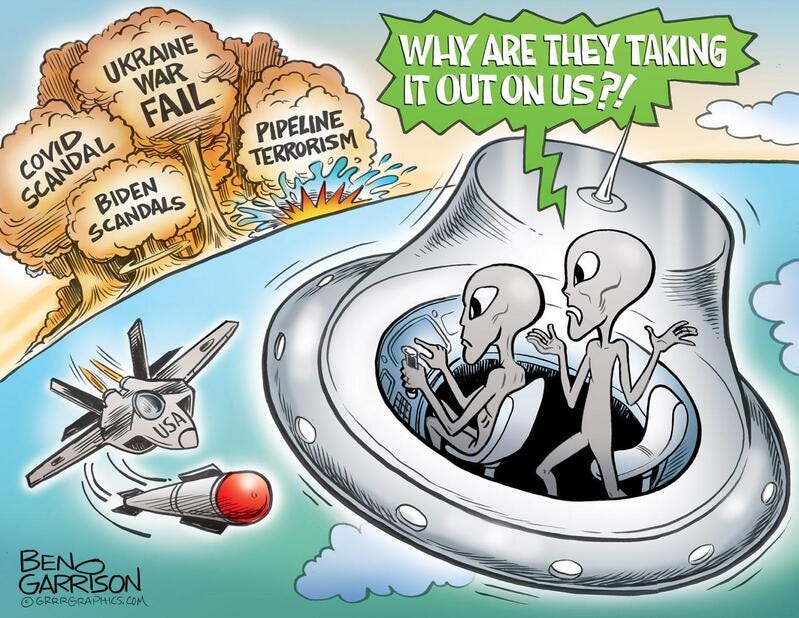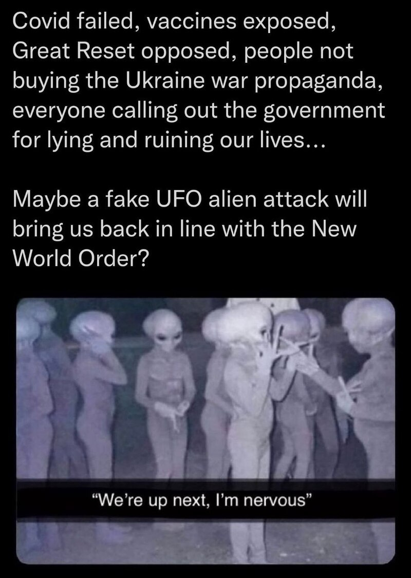With the vaccine narrative unravelling… and the economy imploding… and Ukraine’s military and the front on the bring of collapse… and the revelations the US blew up the Nordstream pipeline… and the Epstein client list… and the Chernobyl-like disaster in Ohio… they need a bigger hoax. Although I can’t believe how quickly we are getting moved from the balloon psyop into the UFO-alien psyop, we are fortunate the meme makers are able to keep up!