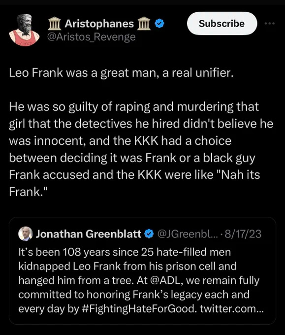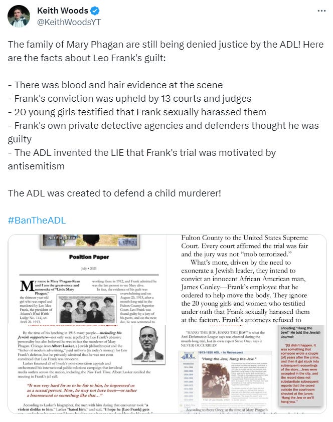 Who is the ADL? They were formed after a Jewish man named Leo Frank was convicted in 1913 of the murder of a 13-year-old employee, Mary Phagan, in Atlanta, Georgia. His trial, conviction, and appeals attracted national attention and he was later kidnaped from prison and lynched two years later in response to the commutation of his death sentence…