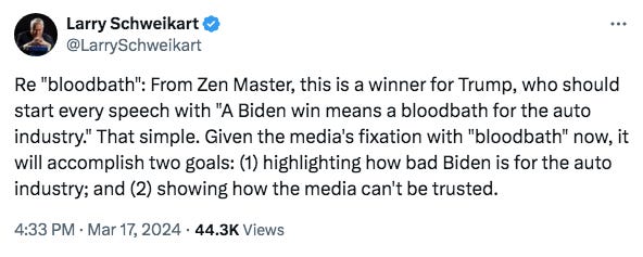 It's too bad that MSM seems to be focusing on the word "bloodbath," rather than the actual damage to the US economy that will result from a more protectionist trade policy. Prices will rise and production become less efficient. Assuming the DJT is reelected and does what he says.