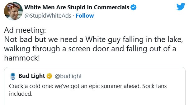 Actually, the ad making out-of-shape white men look foolish was the most honest beer ad I've ever seen. I can remember when beer ads featured superbly fit people who looked like they rarely, if ever drank beer. Also, when a couple of ordinary looking guys popped open their beers, a bunch of beautiful young women appeared. For me, drinking was more likely to make women vanish. But the new ad depicts men acting like drunk men act, i.e. stumbling and spilling food, being unable to balance in a hammock, making the women tote the keg.