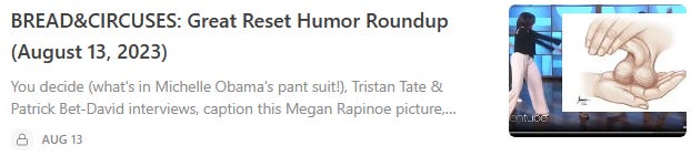 COVIDsteria: An Oral History of America’s Great Reset (Table of Contents) is a fictional satire along the lines of a Studs Terkel oral history or Max Brooks' World War Z published as a serialized book on Substack while Tales From the Great Reset is our occasional satirical short-story series and BREAD&CIRCUSES posts are weekly humor roundups. In addition, check out our Community + Links to Alternative COVID & Great Reset Resources...