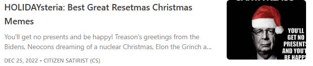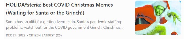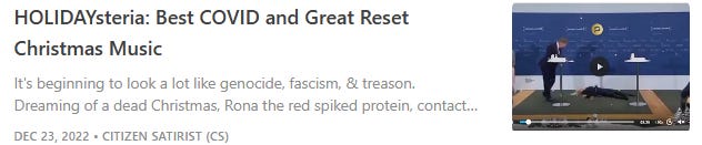 COVIDsteria: An Oral History of America’s Great Reset (Table of Contents) is a fictional satire along the lines of a Studs Terkel oral history or Max Brooks' World War Z published as a serialized book on Substack while Tales From the Great Reset is our occasional satirical short-story series and BREAD&CIRCUSES posts are weekly humor roundups. In addition, check out our Community + Links to Alternative COVID & Great Reset Resources...