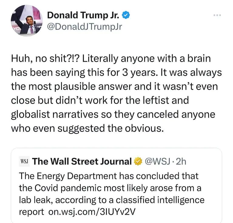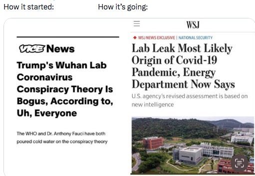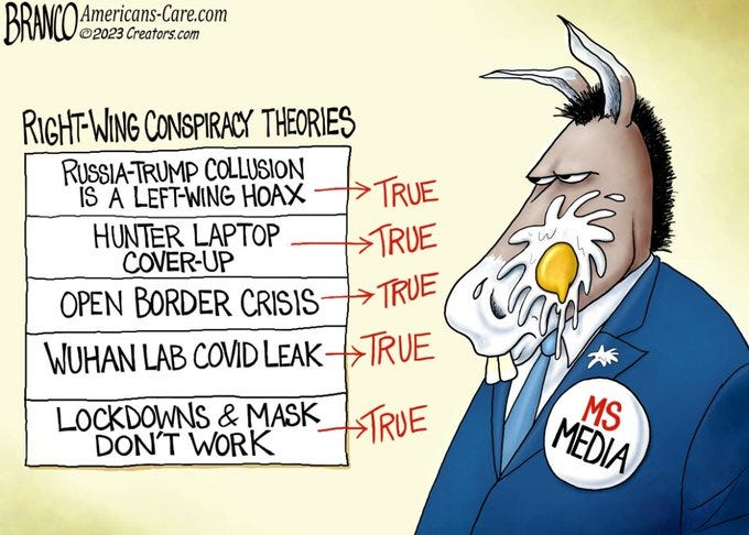 Captain Obvious and not-so-obvious, conspiracy theorists for the win, when the (bought and paid for) media was previously spreading them and more COVID lab leak memes as the Neocons ready us for WW3!