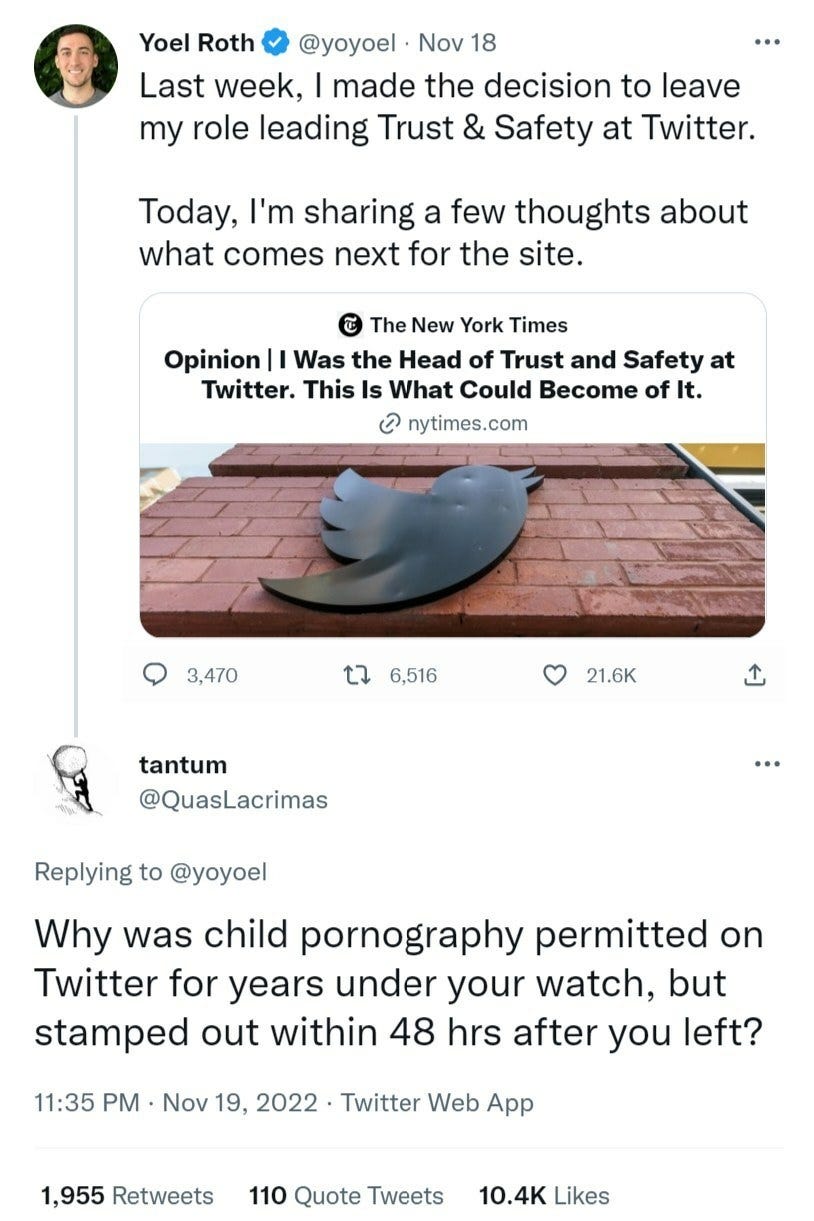 “Twitter’s former head of “Trust and Safety”, Yoel Roth, who wrote his PhD dissertation on the gay sex app Grindr, Inc. (GRND), in which he downplayed safety concerns about minors being exposed to sexual content online…” [see: Twitter Finally Cracks Down On Child Porn]: