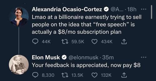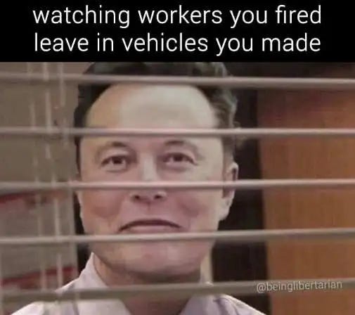 Make no mistake. This is all great fun but Elon is a great reset trojan horse. Elon believes he is the one person doing something concrete about climate change via electrifying cars. Mile for mile electric cars are min 20% worse than current state of internal combustion cars. Is there a place for electric cars? Sure in a mix, but make no mistake if you are an electric car person unless you are only getting your charge from direct solar or wind your electric cat IS COAL powered. Electric vehicle nudnicks are driving the increase of petrochemical use and causing MORE CO2! Mandating electric cars is as dumb as mandating injections that cause you to be preferentially infected by that which for which you were supposedly inoculated. The more you mRNA the more you infect. The more you electrify the more you emit, The scarcer you make energy, the more expensive you make energy.