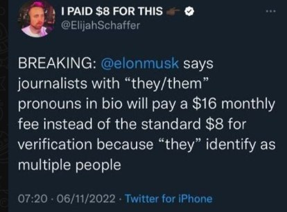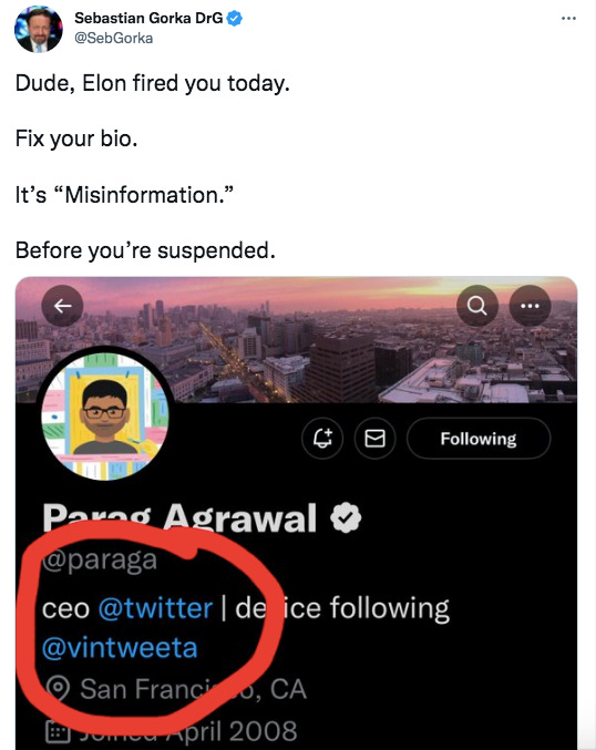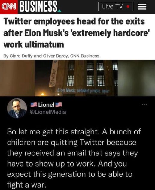 Back to Elon, his buying Twitter is the next WEF directed narrative control and the general public needs less MUCH nudging to buy the electrification than they needed to exclude their unmasked Uncle (or untested gene therapy skeptic aunt) from Thanksgiving dinner. Elon, using Twitter, will be there to scoop up mis and mal info regarding #inventedclimatecrisis and be promoting #energystupidity. Keep on rockin in the free world.