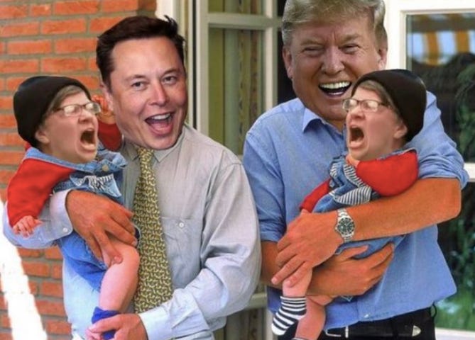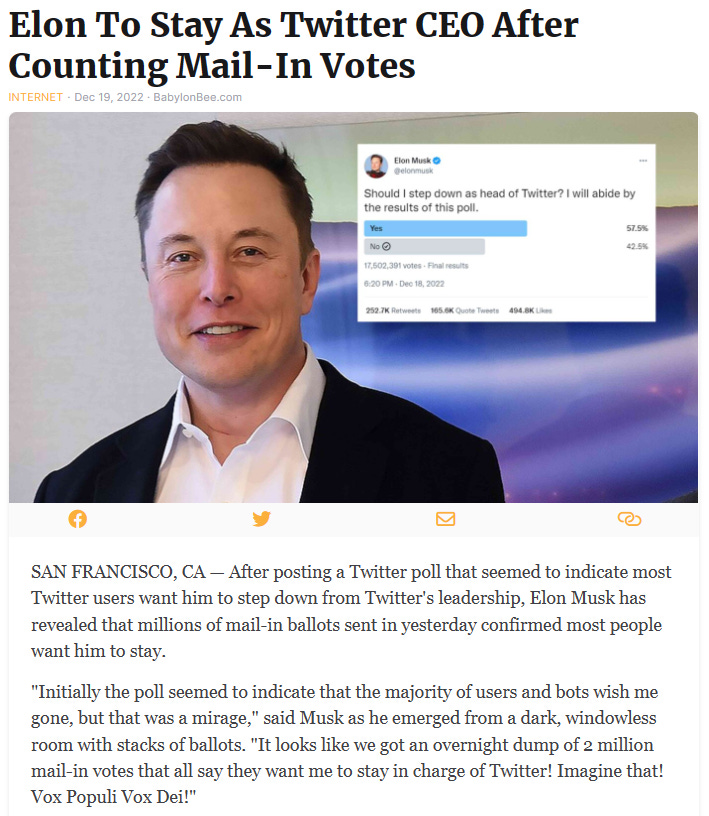 So many great ones. That Babylon Bee meme re the mail-in votes to keep Elon as CEO? Made me laugh out loud. Thank you!