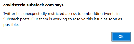 My guess is that its nothing nefarious and there is no reason for Twitter NOT to want tweets embedded in as many places as possible… I HOPE its resolved by Sunday for my BREAD&CIRCUSES post…