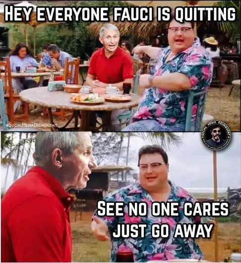 I have already done a few Fauci meme collection posts (Fauci, Part 2, Part 3, Part 4, Part 5 (Has Covid), Part 6 (Rat Plans to Leave!) & Part 7) and now its time for another one with my remaining memes…