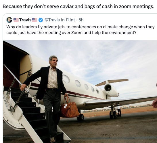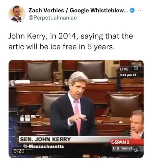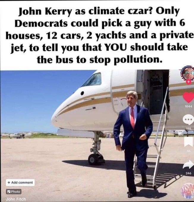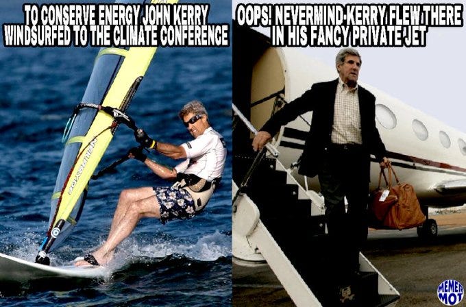 Yet another Democrat (John Kerry) caught on tape making gaseous emissions, the real reason seas are rising, a glitch in the Matrix or an act of God freezes their planes, and more global warming memes!