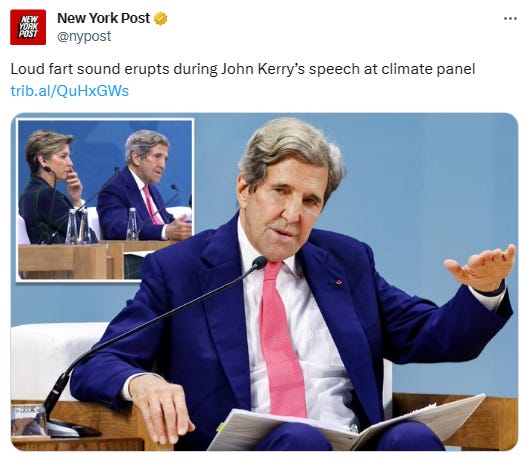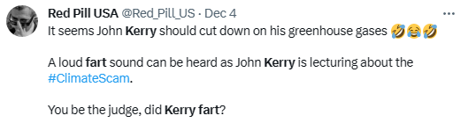 There was another global warming conference and yet another Democrat (this time climate hypocrite John Kerry) caught on tape making gaseous emissions: