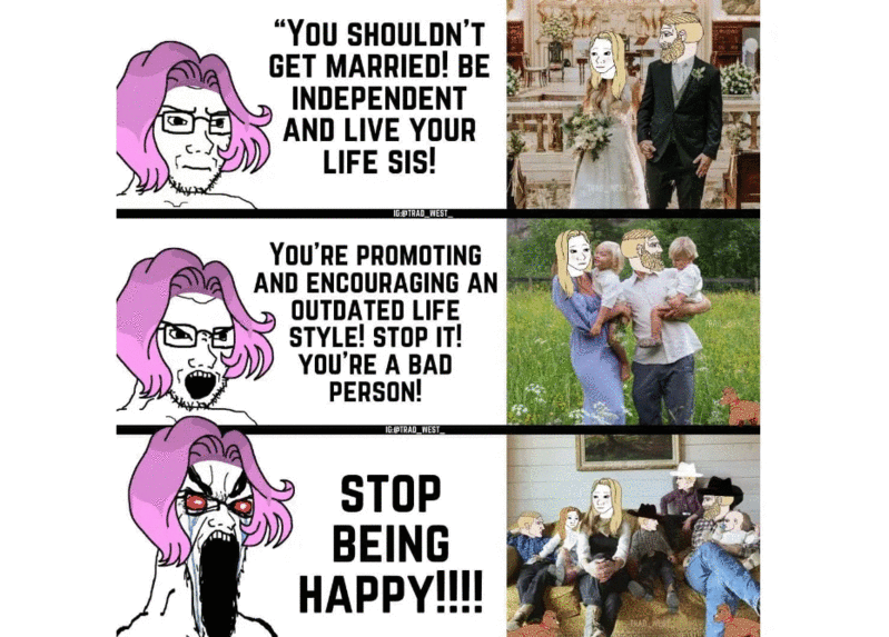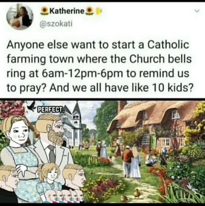 That one meme asking to join a a Catholic farming village, having 10(!) kids and being reminded to pray when bells ring sounds exactly like the Arab nation families that also have large numbers of offspring that the wife is left to raise and also they are also reminded to pray multiple times a day by the Adhans from the minarets. Cults are the same everywhere.