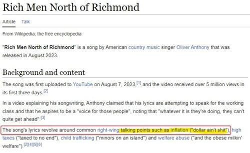 Wikipedia’s since edited page on "Rich Men North of Richmond" initially claimed that “the song’s lyrics revolve around common right-wing themes such as inflation ....”