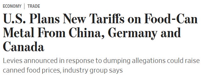 The Biden administration on Thursday announced new tariffs on can-making metal imported from China, Germany and Canada, a move that food companies say could lead to higher prices for some canned foods.