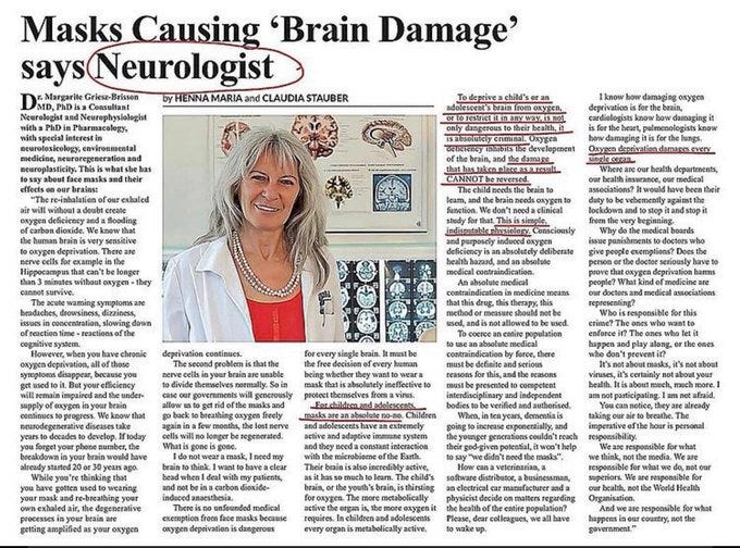 The article "Masks causing brain damage...." is from https://thelightpaper.co.uk/issues/the-light-issue-3-november-2020 . The quoted neurologist apparently writes in German, but her work is referenced at various English-language sites including at https://www.aier.org/article/masking-children-tragic-unscientific-and-damaging/