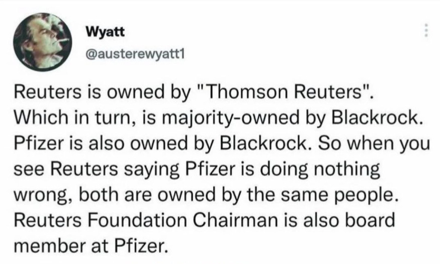 As far as I can tell, Thomson-Reuters is majority owned not by Blackrock but by Woodbridge Co Ltd., a Canadian operation benefiting the heirs of Thomson. See https://en.wikipedia.org/wiki/The_Woodbridge_Company, which is consistent with information from my brokerage.