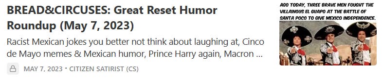 NOTE: I thought my meme posts on the CIA and Antisemitism Awareness Act had ruffled some feathers, but it was actually Substack having a hiccup yesterday as it appeared my original BREAD&CIRCUSES: Great Reset Humor Roundup (May 5, 2024) post did not get emailed out as it was not showing up on my dashboard at the backend + plus drafts were not saving… Looks like the post did get emailed and things have been fixed since then…