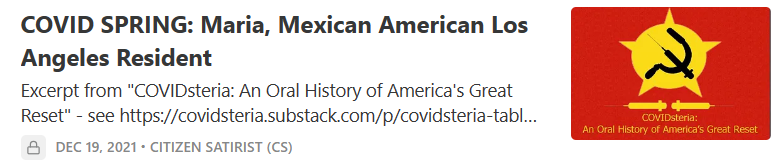 COVIDsteria: An Oral History of America’s Great Reset (Table of Contents) is a fictional satire along the lines of a Studs Terkel oral history or Max Brooks' World War Z published as a serialized book on Substack while Tales From the Great Reset is our occasional satirical short-story series and BREAD&CIRCUSES posts are weekly humor roundups. In addition, check out our Community + Links to Alternative COVID & Great Reset Resources...