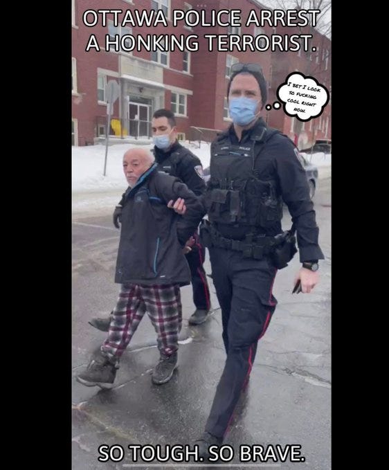 Meanwhile, covid crimes conspirator Justin Trudeau accuses all his many-colored critics of being “racists”, and he accuses these kind freedom loving Canadians who are peacefully assembled in Ottawa of being “domestic terrorists”.