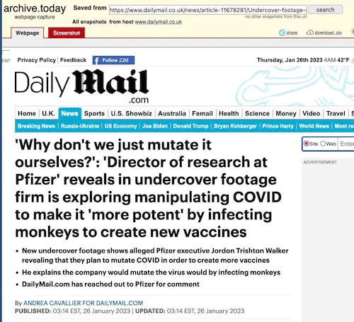 Going… going… gone… https://archive.is/2023.01.26-083937/https://www.dailymail.co.uk/news/article-11678281/Undercover-footage-reveals-Pfizer-exploring-manipulating-COVID-make-potent.html: