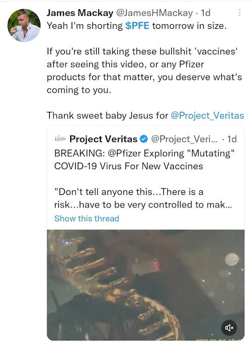 Pfizer’s response is here and there is no mention of this guy in it - see Dr. Malone’s analysis, Pfizer Responses to Veritas Expose, that of Steve Kirsch, Wow! Pfizer does NOT deny anything in the Project Veritas video!, and Zero Hedge, Pfizer Responds After Director Says Company Is Developing Ways To Mutate COVID-19 and Busted Pfizer R&D Exec Claims He Lied About "Mutating COVID" To "Impress A Date Like Normal People").