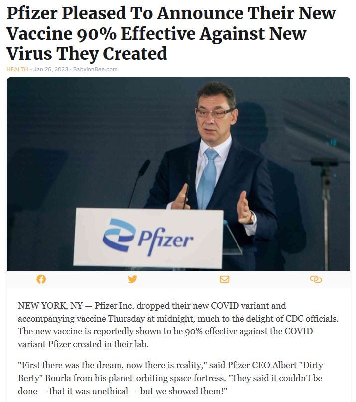 COVIDsteria: An Oral History of America’s Great Reset (Table of Contents) is a fictional satire along the lines of a Studs Terkel oral history or Max Brooks' World War Z published as a serialized book on Substack while Tales From the Great Reset is our occasional satirical short-story series and BREAD&CIRCUSES posts are weekly humor roundups. In addition, check out our Community + Links to Alternative COVID & Great Reset Resources...