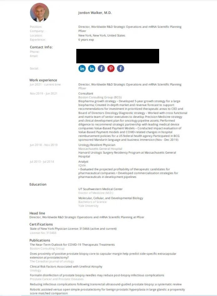 Assuming the CV is accurate and not embellished (and I doubt there would be much checking of a box checker’s background by HR given the need to meet diversity targets), Jordan probably worked for Boston Consulting Group doing a “growth strategy” consulting project where he was seconded to Pfizer before being hired by them to work full time on the business side of their business.