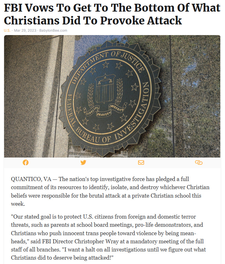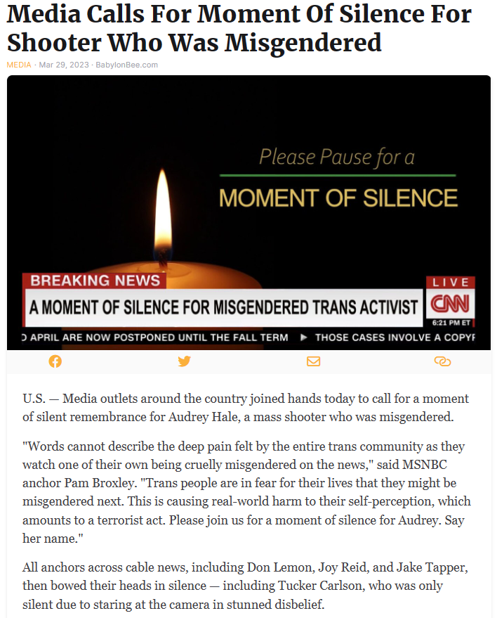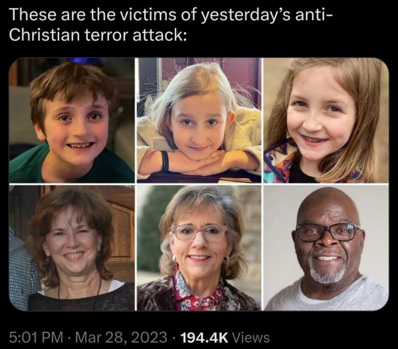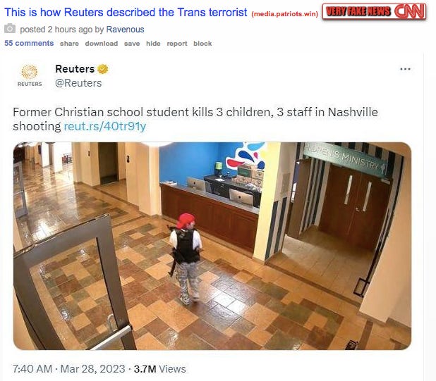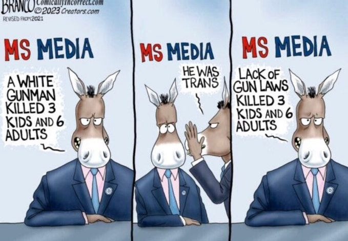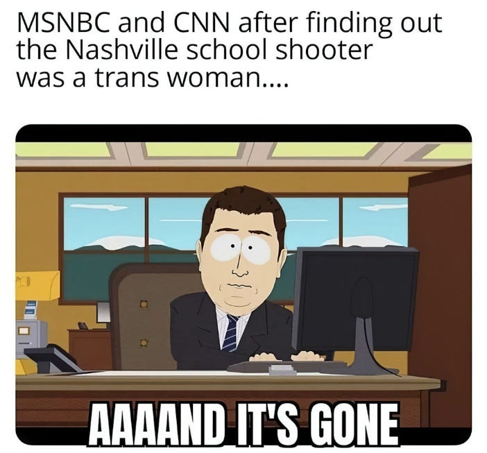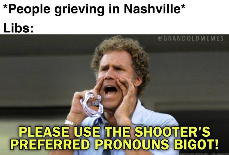 It’s been a week since the trans shooter targeted the Christian school in Tennessee. I know mass school shootings are NOT a funny topic, but the usual hypocritical reaction from the usual suscpects is worth poking some fun at... (also see Best Uvalde Police and Mass Shooting Memes (Offensive Humor Warning) & Part 2).
