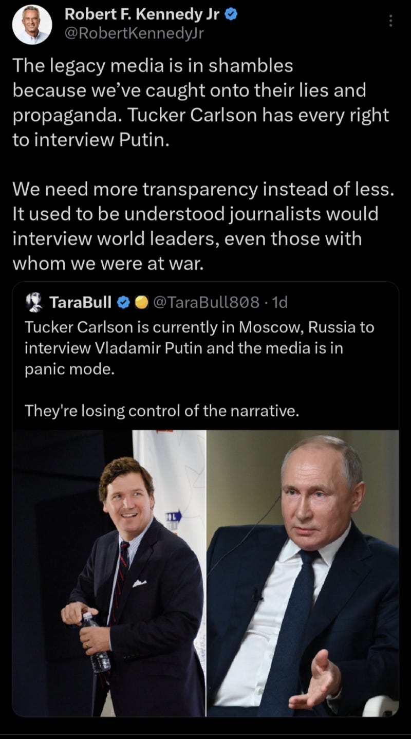Putin won't meet with the American "president", but will with an American journalist. I opine that this makes Biden the New "Mr. Irrelevant" since Brock Purdy has shed that nickname by hugely exceeding expectations. Biden has failed miserably to meet his supporters' expectations, but he is doing exactly what his puppetmasters want.