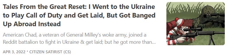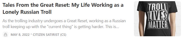 COVIDsteria: An Oral History of America’s Great Reset (Table of Contents) is a fictional satire along the lines of a Studs Terkel oral history or Max Brooks' World War Z published as a serialized book on Substack while Tales From the Great Reset is our occasional satirical short-story series and BREAD&CIRCUSES posts are weekly humor roundups. In addition, check out our Community + Links to Alternative COVID & Great Reset Resources...