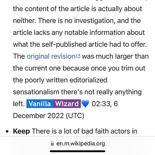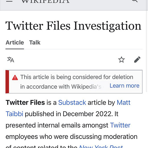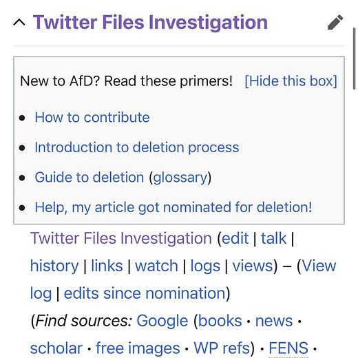 The Twitter files are dropping faster than ballots at 2AM on election night BUT don’t tell Wikipedia that: