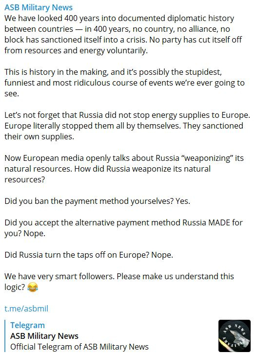 Wait a second: Do the feckless Europeans need some [private equity and Democrat donor owned] coal or energy this winter [Link: https://t.me/asbmil/3814]?