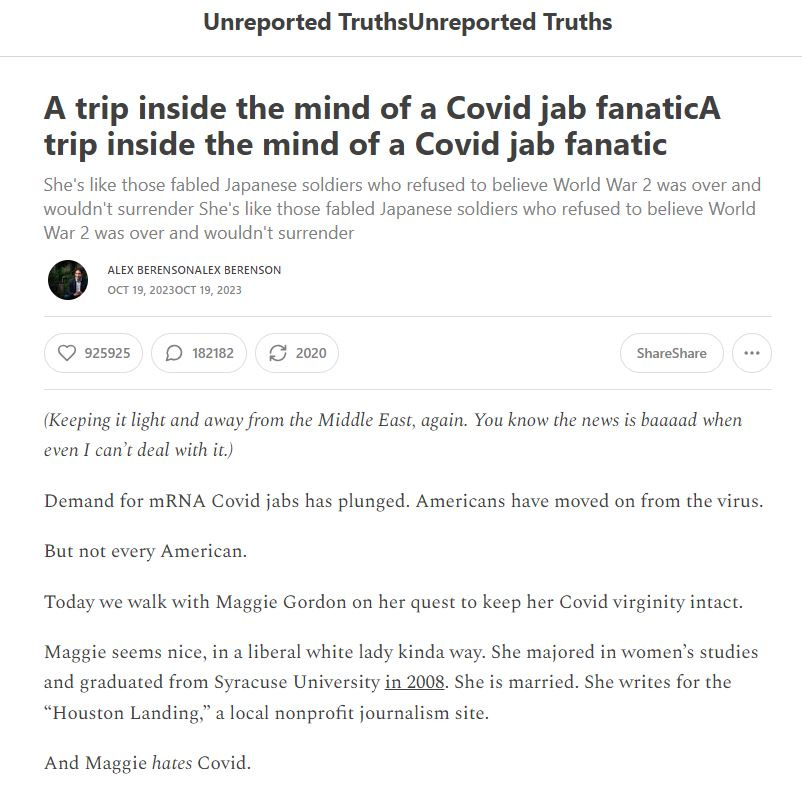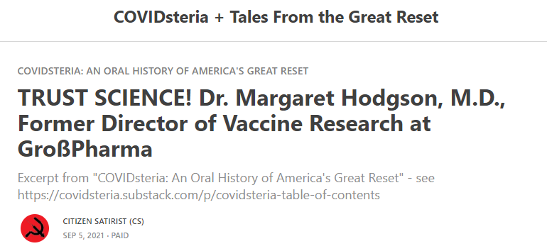 COVIDsteria: An Oral History of America’s Great Reset (Table of Contents) is a fictional satire along the lines of a Studs Terkel oral history or Max Brooks' World War Z published as a serialized book on Substack while Tales From the Great Reset is our occasional satirical short-story series and BREAD&CIRCUSES posts are weekly humor roundups. In addition, check out our Community + Links to Alternative COVID & Great Reset Resources...