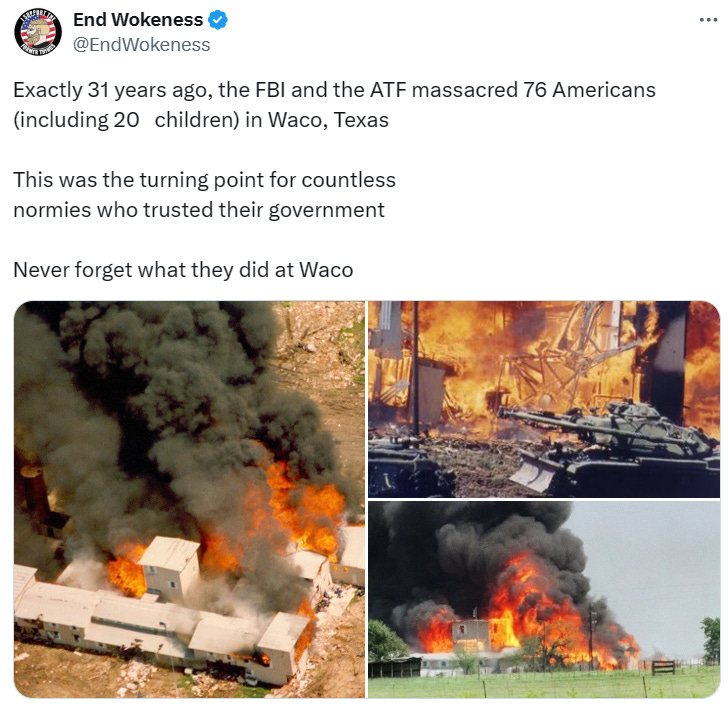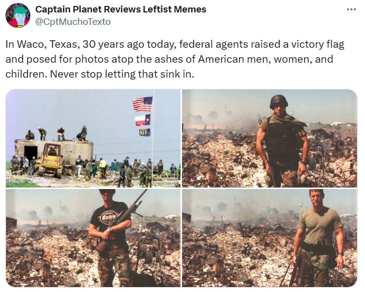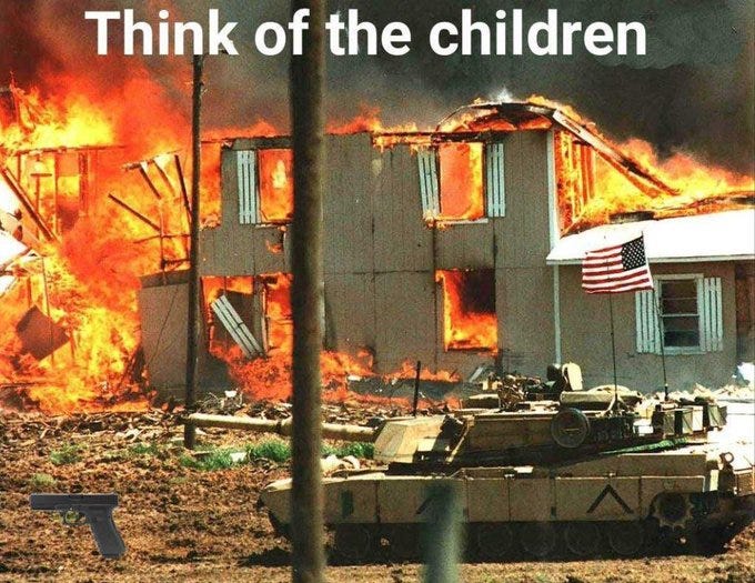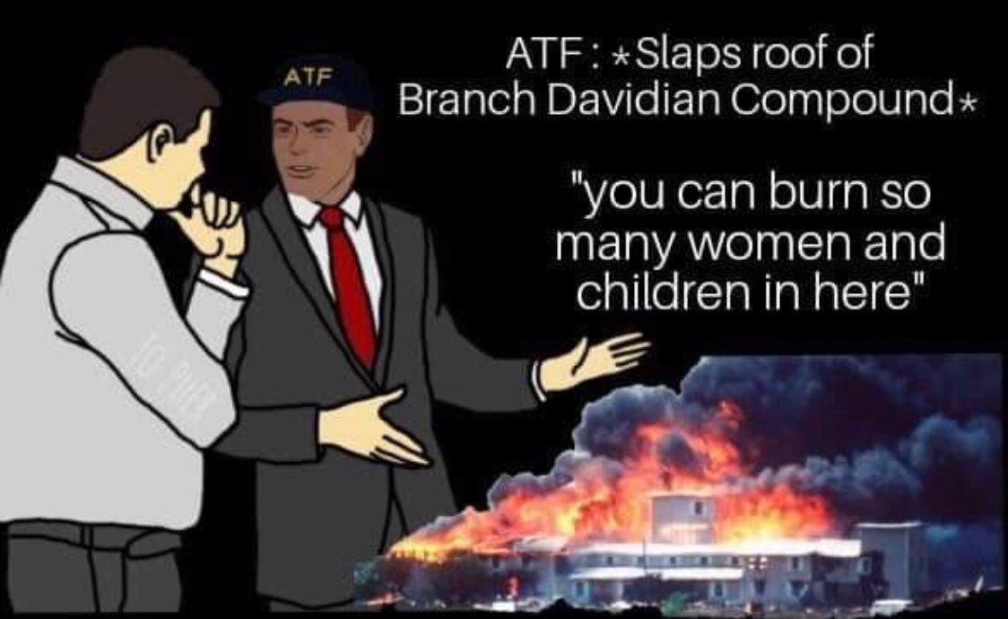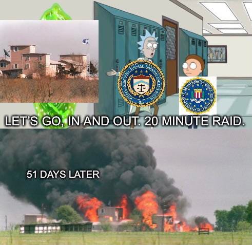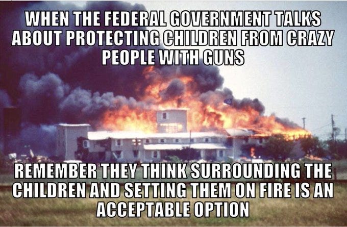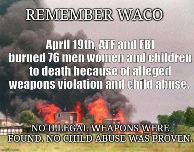 The FEDs had to burn the children in order to save them, Waco-ing the children, the ATF even raised a victory flag over the charred children and more Waco anniversary memes - we were warned!