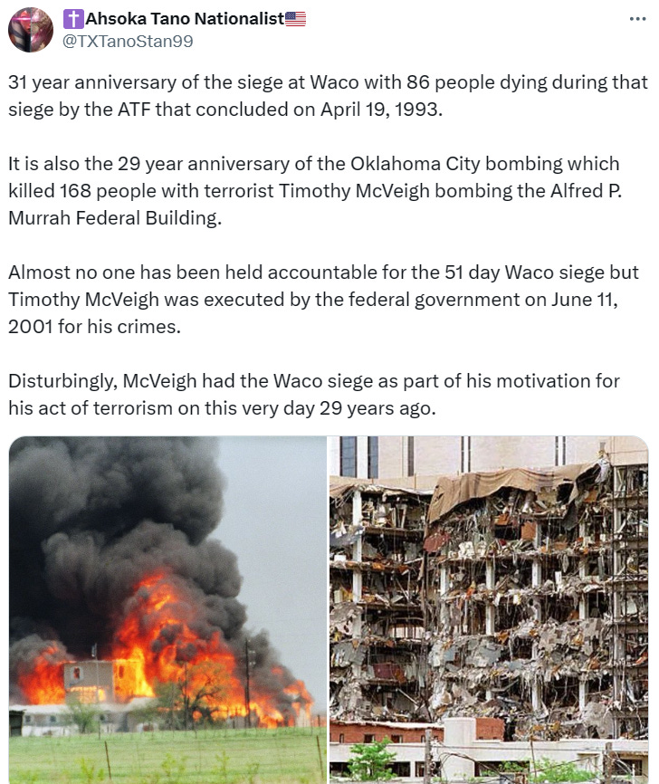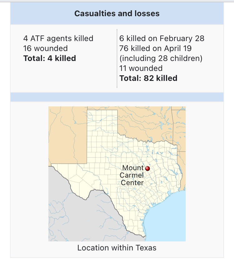 Yesterday was the anniversary of when the FEDs (starting with the ATF) decided to eliminate a group of eccentric religious people in Waco TX who had deeply embarrassed them: