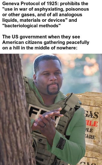 Thank you so much for this. Depressing, infuriating, but spot on. You could add Philadelphia, 1985 -- although that was local "law enforcement" vs. federal a-hole thugs. Local "men in blue" blew up a house with people in it, destroying it and them and countless nearby homes for blocks: https://www.vox.com/the-highlight/2019/8/8/20747198/philadelphia-bombing-1985-move