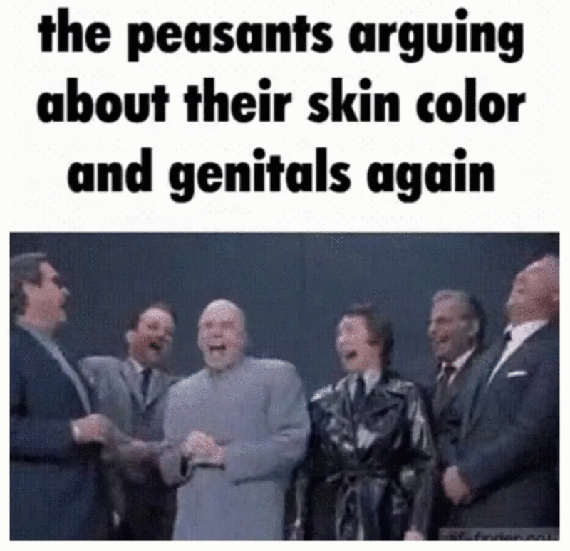 Peasants arguing about genitals and skin colour... Exactly! What I always say. The easiest talking point which can make people talk and argue. But for absolutely no purpose.