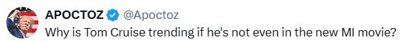 For this week’s Bread & Circuses roundup, blockbuster movies: Make the Dancefloor Great Again!, Mission Incompetent! & Trump Saves Freedom (The Whale)… OTHER HIGHLIGHTS: Duck Dynasty’s Willie Robertson, entrepreneur Marc Andreessen, Dirty Jobs' Mike Rowe etc interviews... 🤣 This doctor specializes in treating Trump Derangement Syndrome (TDS)... 🤣 Some Thanksgiving leftover memes (Turkeymala…)…🤭 Describe this trans activist who is suffering from TDS in 4 words or less... 😲 “Tim Walz” is not taking his loss well… 🙄 Worse tattoos ever… 😲 Watch a cockroach farm in China (or school lunch production as recommended by the WEF…) 😲 Beware of liver flukes and other parasites…