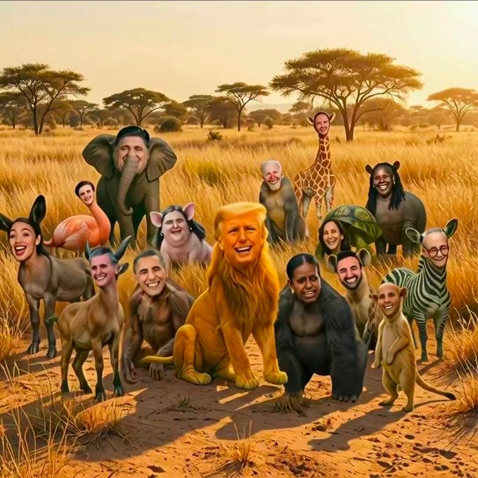 For this week’s Bread & Circuses roundup, Trump is the King of the Jungle…OTHER HIGHLIGHTS: 🏫 How afraid of nurses should we be? 🔥 Don’t forget to open a Trump account for your kid…🔥 James Kunstler, Dave Collum & Tom Luongo on one podcast; Pizzagate was real along with alot more with Ian Carroll; AJ Gentile on giants, the pyramids and remote viewing, etc… 😉 Be sure to welcome Kamala or rather a staffer for her to Substack… 🤣 Fat JD is doing some research regarding that meme with the Obamas as primates that Trump posted… 🦍 Trump apologies to gorillas + more Lion King monkey business memes…🤭 When The Donald did Fresh Prince of Bel Air…🤭 Do you like this version of Nancy? 🎞️ Pretti Good - the trailer…🙄 Recycling in 2026…🤣 And I’ve watched Karen get body slammed 100 times already…