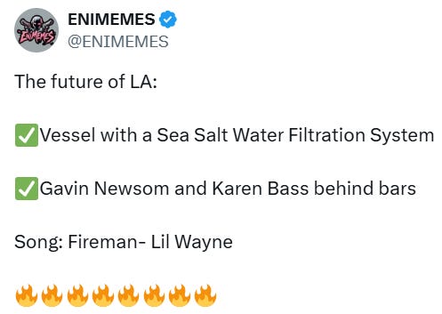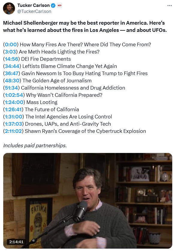 🔥Michael Shellenberger (author of San Fransicko: Why Progressives Ruin Cities and is on Substack here) is a real journalist based in California who gave some background about the fires that you won’t hear from the media: