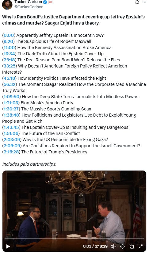 For this week’s Bread & Circuses roundup, asking AI to create an “honest Carnival cruise ad…” + the fatigue is real… OTHER HIGHLIGHTS: 🔥Nick Fuentes and Alex Jones talk Epstein, Saagar Enjeti on the Epstein coverup, the President of Iran etc… 🔥 Investigative reporter Steve Robinson of the Maine Wire on what the heck is going on in Maine… 😲 That time Kamala told a Muslim podcaster that bacon makes every food taste better… 🤣 Asking AI to generate a short video of various countries as if it were a person… 🙄 No longer a flash flood expert - now an Epstein client list expert...