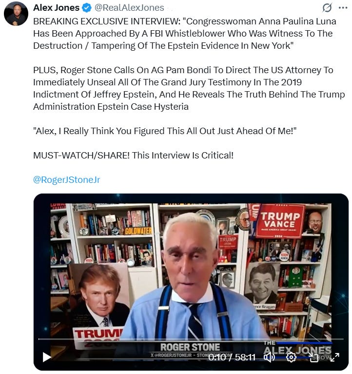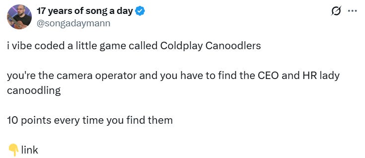 For this week’s Bread & Circuses roundup, AI video of some of the perverts who visited Epstein’s Island + find the Coldplay cheaters in the Coldplay Canoodlers game… OTHER HIGHLIGHTS: 🤬 Beware of hospitals trying to harvest your organs for profit… 🔥 When short sellers conspire with the DOJ and the media to destroy your company + Charlie Kirk & Ana Kasparian (from the Young Turks starts making sense…) 🤣 More Hunter Biden, Champion of Dem values & the working man, for President! 🙄 Rashida Talib the drummer + name this band... 😲 The serial butt-sniffer arrested again in Burbank looks familiar… 🤔 What's up with Newscums Newsom’s weird hand movements? 🤣 Sports team mascots are now re-enacting the Coldplay cheaters incident + a final reminder…
