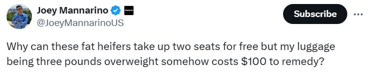 For this week’s Bread & Circuses roundup, some tips for flying Southwest as a plus sized heifer woman + how many airline seats do you think this woman will need? OTHER HIGHLIGHTS: 🔥 MUST listen to episode of The Duran… 🔥 Another good interview of Catherine Austin Fitts + Larry C. Johnson… 🔥 Great Tucker interviews with Tucker Max + Aleksandr Dugin + OANN's Dan Ball... 🔥 Satirical cartoonist Jimbob… 🤭 Something everyone can agree on - f*ck Joe Biden!… 🤡 “There is an infinite amount of cash at the Federal Reserve…” 🤣 The trial of Donald Trump sponsored by George Soros… 🙄 Caption this Bill Clinton photo… 🤦♂️ Bad first days at work… 😲 What do you notice about this picture of Michelle Obama? 🤣 Mayor Pete when he heard he was going to be Secretary of Transportation… 🙄 The secret life of cats - they do nothing but f*ck with each other…🤦♂️ Why was Dad saying he was going to beat that kitty last night?