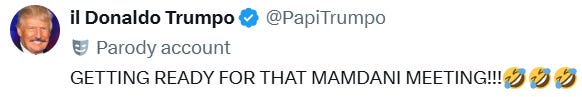 For this week’s Bread & Circuses roundup, Mamdani meets Trump at the White House… OTHER HIGHLIGHTS: 🔥 The Russian Army rescues war corespondent Patrick Lancaster’s Mother In-law… 🔥 November 22 was the 62nd anniversary of JFK’s assassination - Roger Stone’s case against LBJ… 🔥 More about Thomas Crooks, Craig Fuller of FreightWaves says the economy is very weak, Dr. Mary Talley Bowden, Nikki Haley’s son on Tucker, etc. 🔥 Our Congress is a joke… 🤣 Guess who didn’t past Joe Biden’s sniff test… 🫣 More Rep. Brad Sherman looking at porn on a flight… 😲 What happens in Kiev does not stay in Kiev… 🙄 European vs. American innovation… 🙄 When AI goes woke…