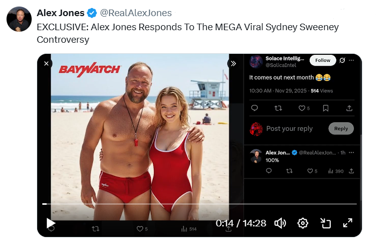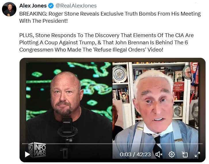 For this week’s Bread & Circuses roundup, some Thanksgiving leftovers… OTHER HIGHLIGHTS: 🔥 Roger Stone, Robert Barnes & Emerald Robertson on Alex Jones about what’s coming next… 🔥 Alex Jones explains the viral Sydney Sweeney & him meme…🔥 Tucker is in “Great” Britain talking to the insufferable Piers Morgan, George Galloway, etc… 🤦♂️ We were robbed of four more years of this man in the White House… 🤣 Leave Harry Sisson alone…🤣 Big Mike has male jeans… 😒 You vs. the economy… 🤭 Why Venezuela airspace was closed…🤦♂️ Gravity is racist… 🤢 White people never had Thanksgiving this good…😎 This was cool but I don’t approve of letting kids eat this garbage!