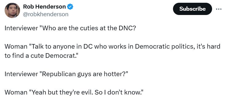 For this week’s Bread & Circuses roundup this Labor Day weekend, are you or a loved one suffering from TDS - also known as Trump Derangement Syndrome? + White Dudes for Kamala… OTHER HIGHLIGHTS: 🔥 RFK Jr. on Tucker & Dr. Phil…🔥Alex Jones interviews… ChatGPT… 😲 Is Kamala’s stepdaughter the most beautiful woman in the world…?🙄 Are you plus sized and planning to walk around Disneyland all day? You might want to use this balm to prevent your sexy legs from chaffing… 🤣 Memers & social media influencers, please STOP being mean to plus sized people! 🤭 Steve Inman’s new Non-essential Commentary Animal Page… 🤦♂️ She tries and fails to pull the race card on a cop... 🤦♂️This man is all PREPARED to visit India...