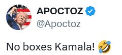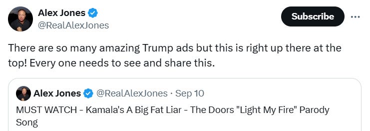 For this week’s Bread & Circuses roundup, are you ready for Kamala AI? + more Kamala debate memes… OTHER HIGHLIGHTS: 🔥Magnetic pole shifts and the end times…🔥Tucker’s tour with Glenn Beck, Dan Bongino, Megan Kelly, etc… 🏫 Yes, they are eating your pets… 😲 Where has this video of Kamala been for the last 20 years??? 🤣 Is this a recent Gay Dudes for Harris meet-up in Los Angeles??? 🤭 Trump gives Kamala his legendary alpha male handshake…🙄 The real debate moderators… 🤭 Kamala takes the fake accents a little too far…🙄 Give this guy a rapping name… 🤦♂️When it’s hot outside… 🤭Are these fake? (I know fake when I see it…) + remembering the “they are real and they are spectacular…” episode from Seinfeld… 🤔 What is this candy (that your grandma always had) called?